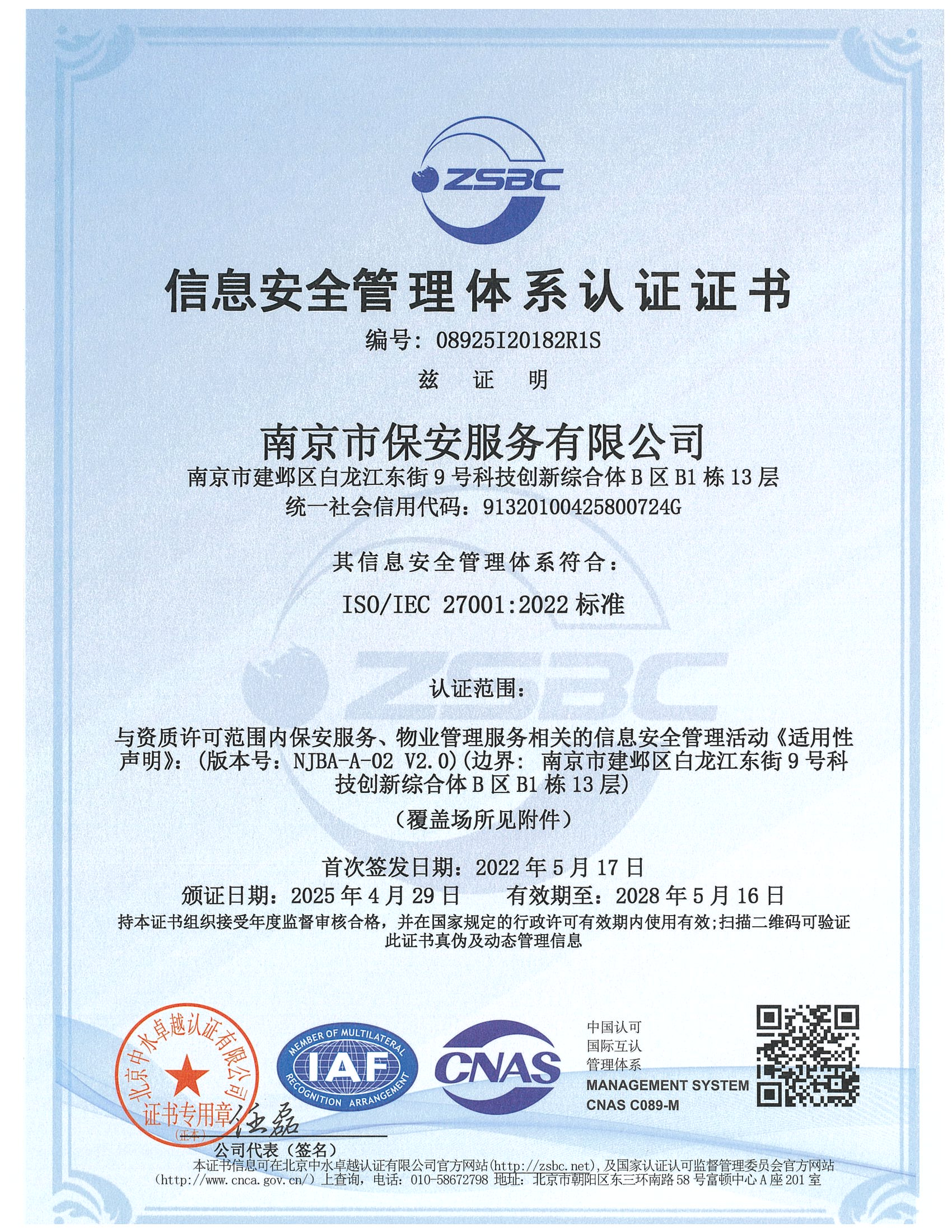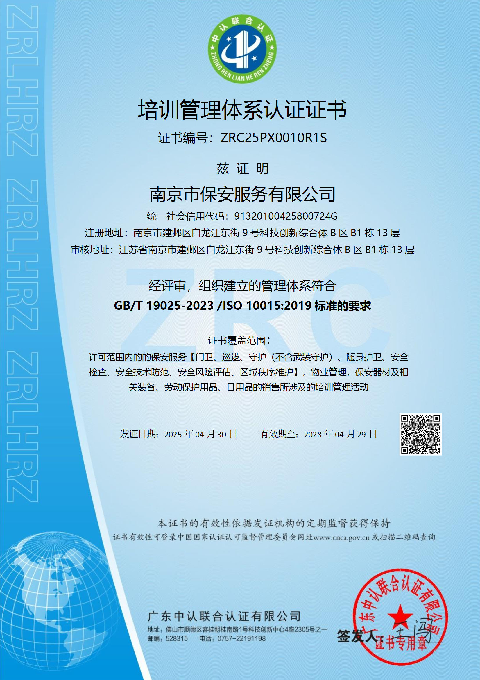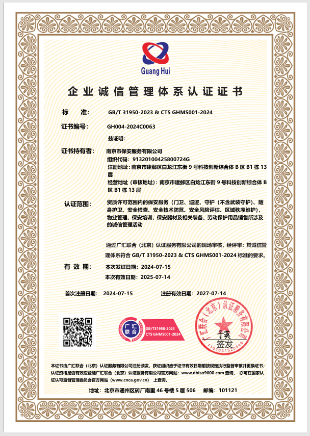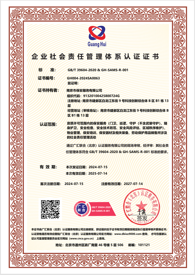 祝賀:南京市保安服務(wù)總公司通過(guò)企業(yè)誠(chéng)信管理體系認(rèn)證和企業(yè)社會(huì)責(zé)任管理體系認(rèn)證